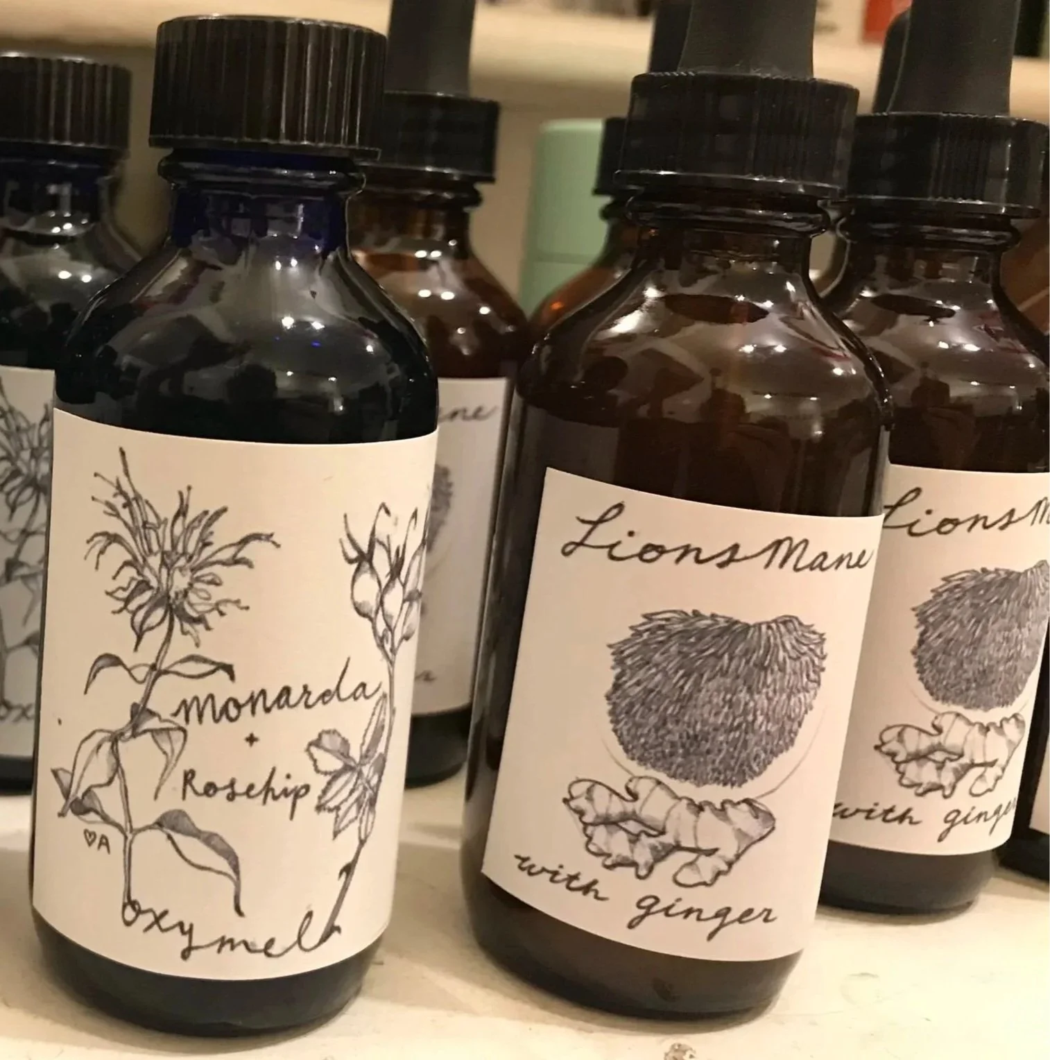 Small-batch tinctures and self-care blends crafted from homegrown herbs.